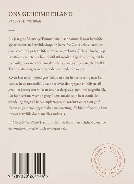Elk jaar ging Vrouwkje Tuinman met haar partner F. naar hetzelfde appartement, in hetzelfde dorp, op hetzelfde Canarische eiland, om daar altijd precies hetzelfde te doen: vrijwel niks. Ze lazen boeken op het strand en lieten er hun hoofd stil worden. Op die ene dag dat het niet zulk mooi weer was, maakten ze een wandeling – steeds dezelfde. Tot ze al die dingen niet meer deden, omdat F. overleed.