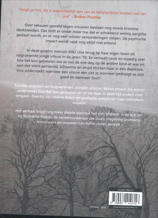 Een hartverscheurend krachtig verhaal van een opgroeiende jonge vrouw die haar pad van verwaarlozing, vernedering, aanranding, schaamte en publieke veroordeling schetst. Auteur Una’s schokkende zelfonderzoek zal meerdere generaties vrouwen kwaad maken en ontroeren en opnieuw bewust maken van het feit dat sexe-ongelijkheid diepgeworteld was en nog is. Het verhaal bereikt een extra dimensie doordat het zich afspeelt in de tijd van de Yorkshire Ripper, die Una’s omgeving jarenlang terroriseert en vrouwen van lichte zeden attaqueert.