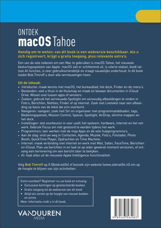 Bob Timroff laat zien hoe je je bureaublad opnieuw inricht, Safari optimaal benut en profiteert van apps als Dagboek, Games en Shortcuts Pro. Ook privacy, veiligheid en toegankelijkheid krijgen de aandacht die ze verdienen. Dit boek is je betrouwbare gids om alles uit macOS 26 te halen, zonder technisch jargon of omslachtige stappen.
