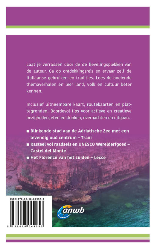 Verken het Italiaanse Puglia op een andere manier met de uitgebreide ANWB Ontdek reisgids Puglia! Natuurlijk mag je bezienswaardigheden zoals de kathedraal in Trani en het stadje Polignano a Mare met zijn steile klippen niet missen, maar ga ook eens van de gebaande paden en ga zee-egels proeven in de Marina di Ostuni, slenter langs het uitgestrekte kiezelstrand van Spiaggia di Vignanotica of maak een reis door de oudheid in het Museo Archeologico in Taranto.