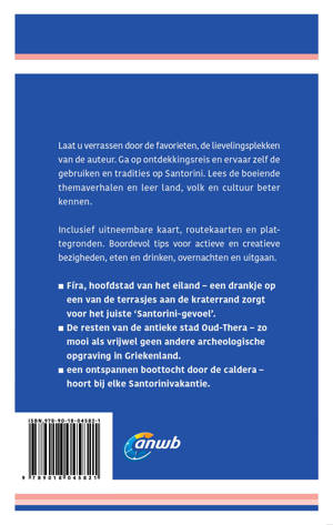 Verken Santorini op een andere manier met de uitgebreide ANWB Ontdek reisgids Santorini! Natuurlijk mag je bezienswaardigheden zoals de ruïnes van Oud-Thera en de witte huisjes met blauwe koepeldaken niet missen. Maar ga ook eens van de gebaande paden en beklim de terrassen bij de kraterrand van Fira? of doe een dagje wellness bij Caldera Massages op de vulkaan. Deze reisgids biedt naast praktische tips over routes, hotels en vervoer ook originele ontdekkingstochten over het eiland. De auteur laat juist díe plekjes zien waar de andere toeristen aan voorbij lopen. Achter in de handzame gids zit een uitneembare kaart. Kortom: deze reisgids is een onmisbare reisgezel tijdens je vakantie op Santorini!