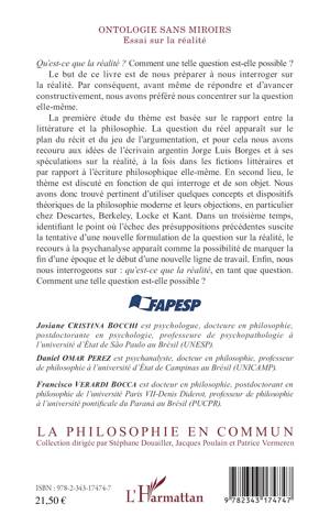 Qu’est-ce que la réalité ? La première étude est basée sur le rapport entre la littérature et la philosophie. La question du réel apparaît sur le plan du récit et du jeu de l’argumentation, notamment dans l’oeuvre de Jorge Luis Borges. En second lieu, le thème est discuté en fonction de qui interroge et de son objet, en rapport à Descartes, Berkeley, Locke et Kant. Dans un troisième temps, identifiant le point où l’échec de ces présuppositions suscite une nouvelle formulation de la question sur la réalité, le recours à la psychanalyse apparaît nécessaire. Enfin, nous nous interrogeons sur : qu’est-ce que la réalité, en tant que question. Comment une telle question est-elle possible ?