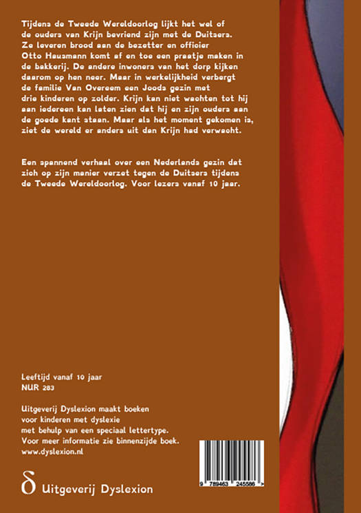 Tijdens de Tweede Wereldoorlog lijkt het wel of de ouders van Krijn bevriend zijn met de Duitsers. Ze leveren brood aan de bezetter en officier Otto Hausmann komt af en toe een praatje maken in de bakkerij. De andere inwoners van het dorp kijken daarom op hen neer. Maar in werkelijkheid verbergt de familie Van Overeem een Joods gezin met drie kinderen op zolder. Krijn kan niet wachten tot hij aan iedereen kan laten zien dat hij en zijn ouders aan de goede kant staan. Maar als het moment gekomen is, ziet de wereld er anders uit dan Krijn had verwacht. Een spannend verhaal over een Nederlands gezin dat zich op zijn manier verzet tegen de Duitsers tijdens de Tweede Wereldoorlog. Voor lezers vanaf 10 jaar.