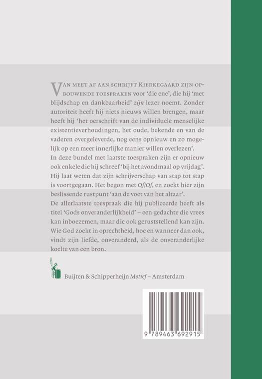 Van meet af aan schrijft Kierkegaard zijn opbouwende toespraken voor ‘die ene’, die hij ‘met blijdschap en dankbaarheid’ zijn lezer noemt. Zonder autoriteit heeft hij niets nieuws willen brengen, maar heeft hij ‘het oerschrift van de individuele menselijke existentieverhoudingen, het oude, bekende en van de vaderen overgeleverde, nog eens opnieuw en zo mogelijk op een meer innerlijke manier willen overlezen’. In deze bundel met laatste toespraken zijn er opnieuw ook enkele die hij schreef ‘bij het avondmaal op vrijdag’. Hij laat weten dat zijn schrijverschap van stap tot stap is voortgegaan. Het begon met Of/Of, en zoekt hier zijn beslissende rustpunt ‘aan de voet van het altaar’. De allerlaatste toespraak die hij publiceerde heeft als titel ‘Gods onveranderlijkheid’ – een gedachte die vrees kan inboezemen, maar die ook geruststellend kan zijn. Wie God zoekt in oprechtheid, hoe en wanneer dan ook, vindt zijn liefde, onveranderd, als de onveranderlijke koelte van een bron.
