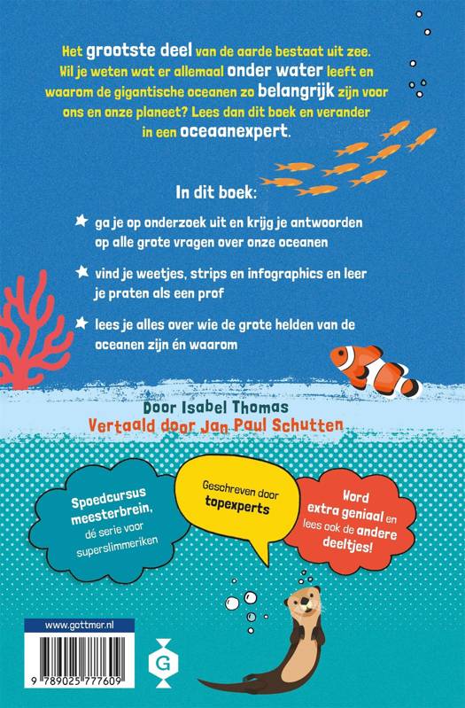 In dit deel van de superslimme serie 'Spoedcursus meesterbrein' leer je alles wat je wilt weten over de zeeën op aarde. Het grootste deel van de aarde bestaat uit zee. Onze onmetelijk grote oceanen zijn mysterieuze plekken vol raadsels. Wist je bijvoorbeeld dat ongeveer twee derde van de diersoorten die in de oceanen leven nog niet ontdekt is? Wil je de raadsels van de zee ontrafelen en weten wat er allemaal onder water leeft? En waarom de gigantische oceanen zo belangrijk zijn voor ons en onze planeet? Lees dan dit boek en verander in een oceaanexpert. In dit boek vind je weetjes, strips en infographics en leer je praten als een prof. Lees alles over wie de grote helden van de oceanen zijn én waarom, en krijg antwoord op alle grote vragen over de oceanen.