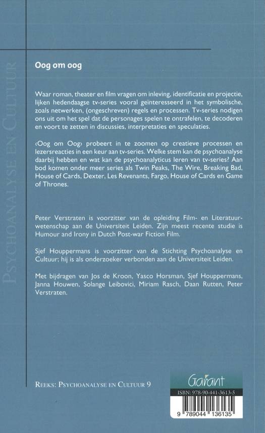 ‹Oog om Oog› probeert in te zoomen op creatieve processen en lezersreacties in een keur aan tv-series. Welke stem kan de psychoanalyse daarbij hebben en wat kan de psychoanalyticus leren van tv-series? Aan bod komen onder meer series als Twin Peaks, The Wire, Breaking Bad, House of Cards, Dexter, Les Revenants, Fargo, House of Cards en Game of Thrones.