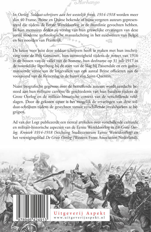 In 'Oorlog: Soldaat-schrijvers aan het westelijk front 1914-1918' worden meer dan veertig Franse, Britse en Duitse bekende of bijna vergeten auteurs gepresenteerd die tijdens de Eerste Wereldoorlog in de frontlinie vochten. In hun memoires deden zij verslag van hun gruwelijke ervaringen van deze eerste moderne technologische massaslachting in het zuidwesten van België en het noorden van Frankrijk.