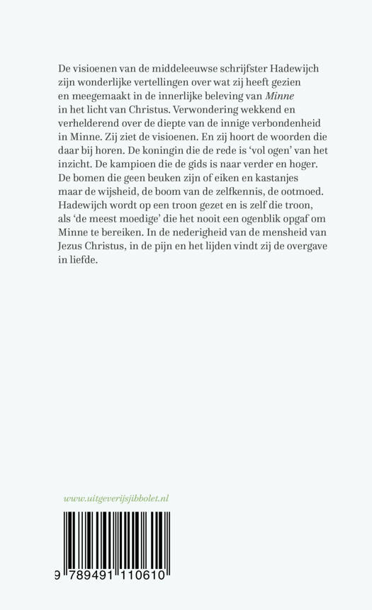 De visioenen van de middeleeuwse schrijfster Hadewijch zijn wonderlijke vertellingen over wat zij heeft gezien en meegemaakt in de innerlijke beleving van Minne in het licht van Christus. Verwondering wekkend en verhelderend over de diepte van de innige verbondenheid in Minne. Zij ziet de visioenen. En zij hoort de woorden die daar bij horen. De koningin die de rede is ‘vol ogen’ van het inzicht. De kampioen die de gids is naar verder en hoger. De bomen die geen beuken zijn of eiken en kastanjes maar de wijsheid, de boom van de zelfkennis, de ootmoed. Hadewijch wordt op een troon gezet en is zelf die troon, als ‘de meest moedige’ die het nooit een ogenblik opgaf om Minne te bereiken. In de nederigheid van de mensheid van Jezus Christus, in de pijn en het lijden vindt zij de overgave in liefde.