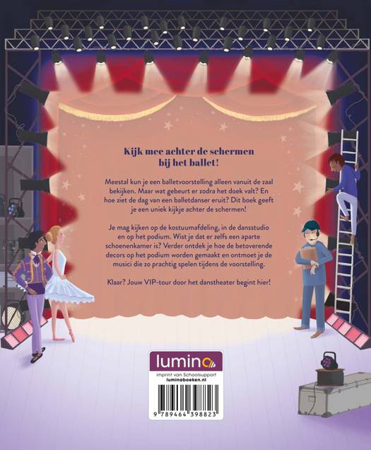 Kijk mee achter de schermen bij het ballet! Meestal kun je een balletvoorstelling alleen vanuit de zaal bekijken. Maar wat gebeurt er zodra het doek valt? En hoe ziet de dag van een balletdanser eruit? Je mag kijken op de kostuumafdeling, in de dansstudio en op het podium. Wist je dat er zelfs een aparte schoenenkamer is? Verder ontdek je hoe de betoverende decors op het podium worden gemaakt en ontmoet je de musici die zo prachtig spelen tijdens de voorstelling. Dit boek geeft je een uniek kijkje achter de schermen!