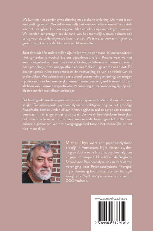 Dit boek geeft enkele impressies van verschijnselen op de rand van het menselijke. De indringende psychoanalytische praktijkvoering en het grondige filosofische denken vinden elkaar in hun pogingen taal te geven aan toestanden waarin het talige onder druk staat. De twaalf hoofdstukken bestrijken het hele spectrum van individuele verwarrende belevingen tot collectieve culturele gedaanten van het overgangsgebied tussen het menselijke en het niet-menselijke.