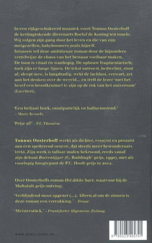 In een rijkgeschakeerd mozaïek voert Tonnus Oosterhoff de kettingrokende dierenarts Roelof de Koning ten tonele. Wij volgen zijn gang door het leven en die van zijn metgezellen, babyboomers zoals hijzelf.