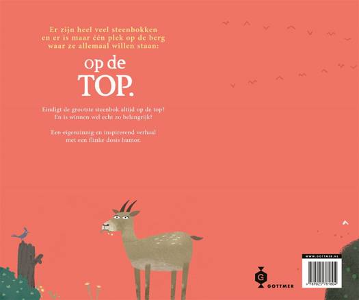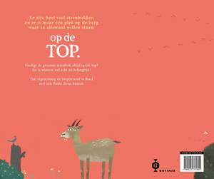 'Op de top' is een prachtig geïllustreerd prentenboek met humor en een filosofisch randje. Er zijn heel veel steenbokken op de wereld, maar er is maar één plekje op de top: het mooiste plekje op de berg, waar iedere steenbok wel wil staan. Een kleine steenbok wordt door de grootste steenbok uitgedaagd voor een gevecht om dit felbegeerde plekje. Een onmogelijke strijd: de kleine steenbok krijgt een fikse kopstoot en neemt de benen. Hij rent van de berg af, over de rivier, door een woestijn, door een bos, springt over een ravijn en ziet dan iets in de verte wat zijn aandacht trekt: een oude wijze berggeit. Hij gaat te rade bij de geit en spoedt zich vol inspiratie terug naar zijn berg, waar hij zijn rivalen verslaat. Nu staat híj op de top. Maar... is winnen eigenlijk wel alles? En is die geit wel zo wijs (en oud) als hij lijkt?