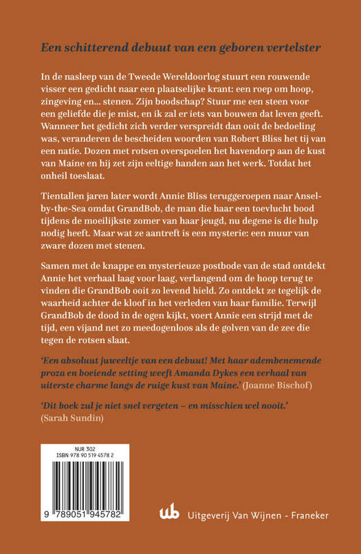 In de nasleep van de Tweede Wereldoorlog stuurt een rouwende visser een gedicht naar een plaatselijke krant: een roep om hoop, zingeving en… stenen. Zijn boodschap? Stuur me een steen voor een geliefde die je mist, en ik zal er iets van bouwen dat leven geeft. Wanneer het gedicht zich verder verspreidt dan ooit de bedoeling was, veranderen de bescheiden woorden van Robert Bliss het tij van een natie. Dozen met rotsen overspoelen het havendorp aan de kust van Maine en hij zet zijn eeltige handen aan het werk. Totdat het onheil toeslaat. Tientallen jaren later wordt Annie Bliss teruggeroepen naar Anselby-the-Sea, omdat GrandBob, de man die haar een toevlucht bood tijdens de moeilijkste zomer van haar jeugd, nu degene is die hulp nodig heeft. Maar wat ze aantreft is een mysterie: een muur van zware dozen met stenen.