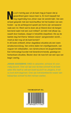 Na zo’n slordige twintig jaar uit de kast mag je hopen dat je geaardheid geen issue meer is. En toch bepaalt het voor Johan nog regelmatig hoe hij naar de wereld kijkt. Van een simpel gesprek met een taxichauffeur tot het boeken van een hostel – op de achtergrond speelt zijn homo-zijn verrassend vaak een rol. Want wat te doen als je hikend door de bergen bevriend raakt met een oud-militair? Je trekt met elkaar op, waadt door beekjes, slaapt in hetzelfde stapelbed. Als op de laatste dag het thema ‘lekkere wijven’ aangesneden wordt… moet je dan nog uit de kast komen?