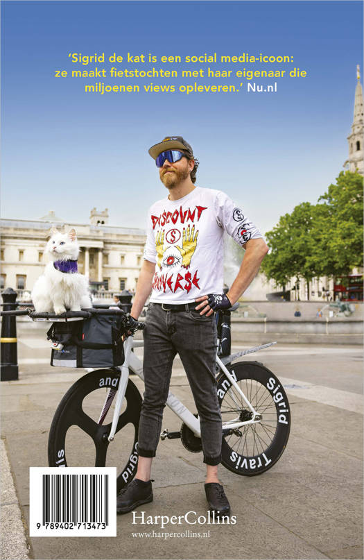 ‘In Londen zorgt een opvallend duo op de fiets voor veel wijzende vingers en vertederde blikken. Met Sigrid de kat voorop in een mand slalomt Travis door de Britse hoofdstad.’ Nederlands Dagblad