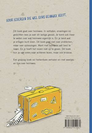 Grappig en herkenbaar non-fictie boek vanaf 10 jaar. Voor iedereen die soms te maken krijgt met heimwee. Ideaal om mee te nemen op kamp of op reis. Een boek vol verhalen, weetjes en tips over heimwee. Dit boek gaat over heimwee. In verhalen, ervaringen en gedichten lees je over dit lastige gevoel. Je komt ook meer te weten over wat heimwee eigenlijk is. En je leest wat je ertegen kunt doen. Dit boek gaat niet over problemen, maar over oplossingen. Want met heimwee valt best te leven. En je hoeft het reizen niet op te geven. Dit boek kun je van voren naar achteren lezen, maar ook kriskras.