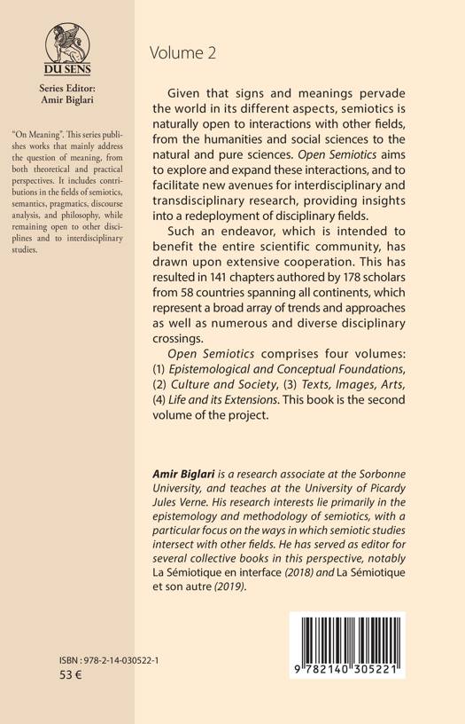 Given that signs and meanings pervade the world in its different aspects, semiotics is naturally open to interactions with other fields, from the humanities and social sciences to the natural and pure sciences. Open Semiotics aims to explore and expand these interactions, and to facilitate new avenues for interdisciplinary and transdisciplinary research, providing insights into a redeployment of disciplinary fields. Such an endeavor, which is intended to benefit the entire scientific community, has drawn upon extensive cooperation. This has resulted in 141 chapters authored by 178 scholars from 58 countries spanning all continents, which represent a broad array of trends and approaches as well as numerous and diverse disciplinary crossings. Open Semiotics comprises four volumes: (1) Epistemological and Conceptual Foundations, (2) Culture and Society, (3) Texts, Images, Arts, (4) Life and its Extensions. This book is the second volume of the project.