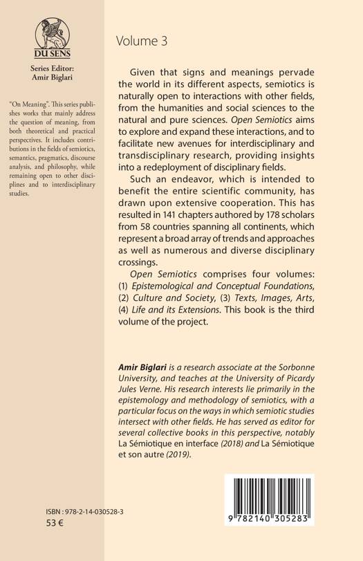 Given that signs and meanings pervade the world in its different aspects, semiotics is naturally open to interactions with other fields, from the humanities and social sciences to the natural and pure sciences. Open Semiotics aims to explore and expand these interactions, and to facilitate new avenues for interdisciplinary and transdisciplinary research, providing insights into a redeployment of disciplinary fields. Such an endeavor, which is intended to benefit the entire scientific community, has drawn upon extensive cooperation. This has resulted in 141 chapters authored by 178 scholars from 58 countries spanning all continents, which represent a broad array of trends and approaches as well as numerous and diverse disciplinary crossings. Open Semiotics comprises four volumes: (1) Epistemological and Conceptual Foundations, (2) Culture and Society, (3) Texts, Images, Arts, (4) Life and its Extensions. This book is the third volume of the project.