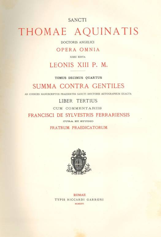 Le premier livre porte sur Dieu, le deuxième sur la création (tome 13), le troisième sur la providence et le gouvernement divin (tome 14) ; le quatrième livre s'attelle à montrer que ce qui relève uniquement de la foi n'est pas contraire à la raison (tome 15). L'édition a bénéficié de l'existence d'un autographe partiellement conservé. Le texte est accompagné du commentaire qu'en a fait au XVIe siècle Sylvestre de Ferrare.