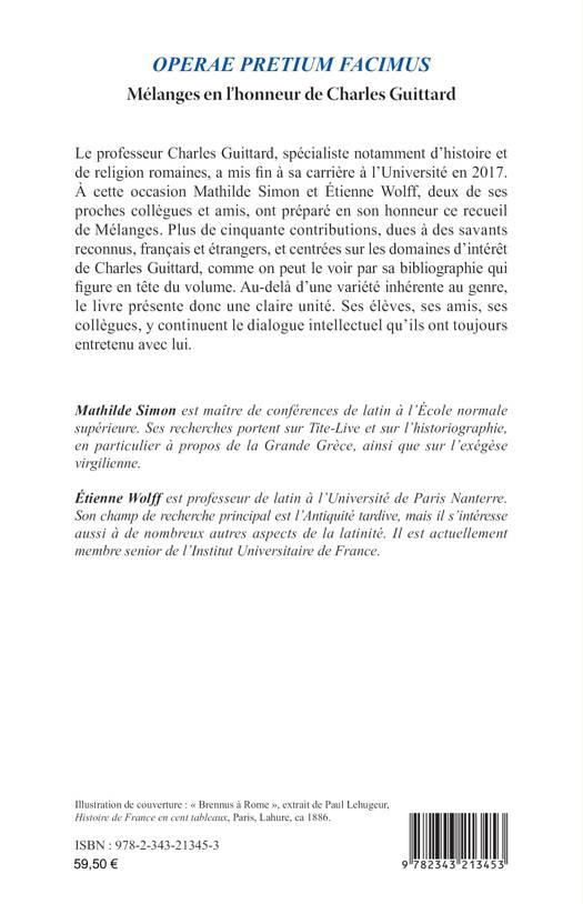 Le professeur Charles Guittard, spécialiste notamment d’histoire et de religion romaines, a mis fin à sa carrière à l’Université en 2017. À cette occasion Mathilde Simon et Étienne Wolff, deux de ses proches collègues et amis, ont préparé en son honneur ce recueil de Mélanges. Plus de cinquante contributions, dues à des savants reconnus, français et étrangers, et centrées sur les domaines d’intérêt de Charles Guittard, comme on peut le voir par sa bibliographie qui figure en tête du volume. Au-delà d’une variété inhérente au genre, le livre présente donc une claire unité. Ses élèves, ses amis, ses collègues, y continuent le dialogue intellectuel qu’ils ont toujours entretenu avec lui.