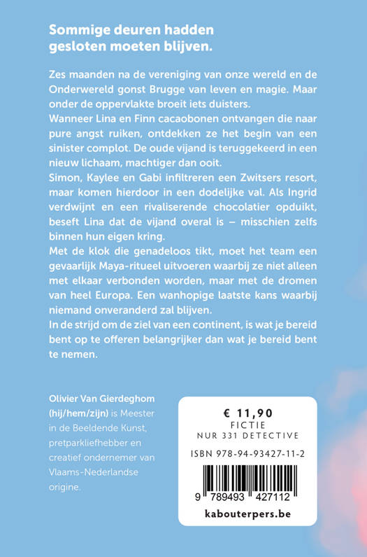 Zes maanden na de vereniging van onze wereld en de Onderwereld gonst Brugge van leven en magie. Maar onder de oppervlakte broeit iets duisters. Wanneer Lina en Finn cacaobonen ontvangen die naar pure angst ruiken, ontdekken ze het begin van een sinister complot. De oude vijand is teruggekeerd in een nieuw lichaam, machtiger dan ooit. Simon, Kaylee en Gabi infiltreren een Zwitsers resort, maar komen hierdoor in een dodelijke val. Als Ingrid verdwijnt en een rivaliserende chocolatier opduikt, beseft Lina dat de vijand overal is – misschien zelfs binnen hun eigen kring. Met de klok die genadeloos tikt, moet het team een gevaarlijk Maya-ritueel uitvoeren waarbij ze niet alleen met elkaar verbonden worden, maar met de dromen van heel Europa. Een wanhopige laatste kans waarbij niemand onveranderd zal blijven. In de strijd om de ziel van een continent, is wat je bereid bent op te offeren belangrijker dan wat je bereid bent te nemen.