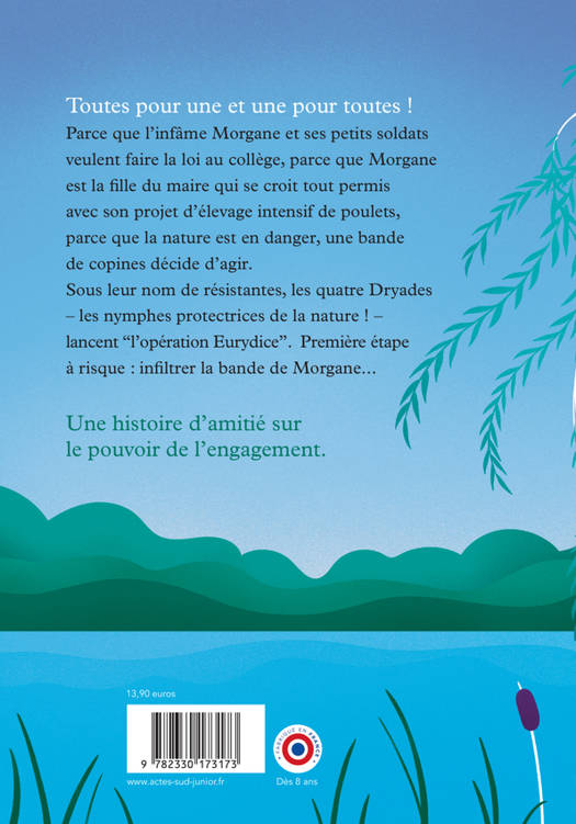 Toutes pour une et une pour toutes ! Parce que l'infâme Morgane et ses petits soldats veulent faire la loi au collège, parce que Morgane est la fille du maire qui se croit tout permis avec son projet d'élevage intensif de poulets, parce que la nature est en danger, une bande de copines décide d'agir. Sous leur nom de résistantes, les quatre Dryades - les nymphes protectrices de la nature ! - lancent "l'opération Eurydice". Première étape à risque : infiltrer la bande de Morgane...