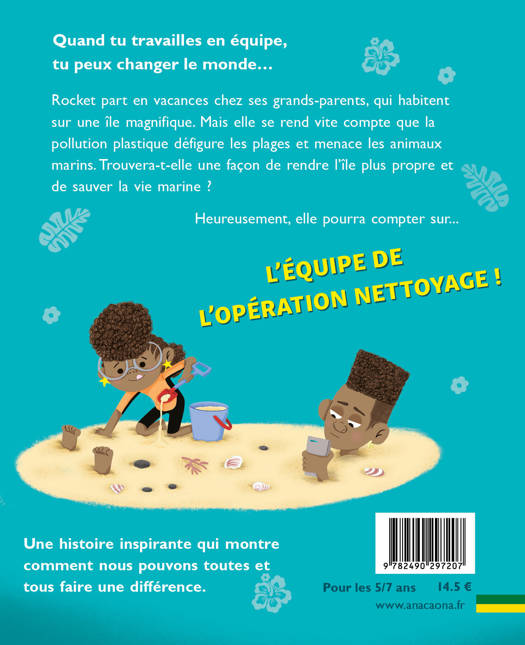 Rocket part en vacances chez ses grands-parents, qui habitent sur une île magnifique. Mais elle se rend vite compte que la pollution plastique défigure les plages et menace les animaux marins. Trouvera-t-elle une façon de rendre l'île plus propre et de sauver la vie marine ? Heureusement, elle pourra compter sur l'équipe de l'opération nettoyage ! Une histoire inspirante qui montre comment nous pouvons toutes et tous faire une différence. Pour les 5/7 ans