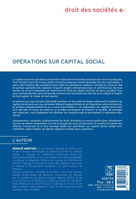 Le présent ouvrage retrace cette belle aventure, et avec elle les règles ordonnant l'existence du capital social ainsi que ses variations faites d'augmentations et de réductions, alternativement, et parfois cumulativement en un « coup d'accordéon ». Les opérations sur capital social sont ainsi décrites et mises en relief en ce qu'elles permettent de financer la société, de protéger ses créanciers, mais également de rétribuer ses associés tout en permettant si nécessaire leur retrait.