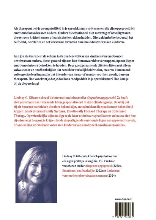Lindsay C. Gibson schreef de internationale bestseller Ongezien opgegroeid. Ze heeft zich gedurende haar werkende leven gespecialiseerd in deze cliëntengroep. Daarbij put zij uit bewezen technieken die alom bekend zijn, en technieken die steeds meer bekendheid krijgen, zoals Internal Family Systems, Emotionally Focused Therapy en Coherence Therapy. Op vriendelijke wijze nodigt ze de lezer uit in haar spreekkamer en laat ze zien hoe zij erin slaagt toegang te krijgen tot de dieperliggende emotionele lagen van geparentificeerde, of anderszins worstelende volwassen kinderen van emotioneel onvolwassen ouders.