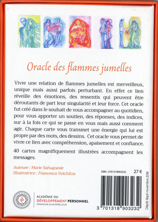 Vivre une relation de flammes jumelles est merveilleux, unique mais aussi parfois perturbant. En effet, ce lien réveille des émotions, des ressentis qui peuvent être déroutants de part leur singularité et leur force. Cet oracle fut créé dans le souhait de vous accompagner au quotidien, pour vous apporter un soutien, des réponses, des indices, sur à la fois ce qui se passe en vous mais aussi comment agir. Chaque carte vous transmet une énergie qui lui est propre par des mots, des dessins. Cet oracle vous permet de vivre ce lien avec compréhension, apaisement et confiance. 40 cartes magnifiquement illustrées accompagnent les messages.
