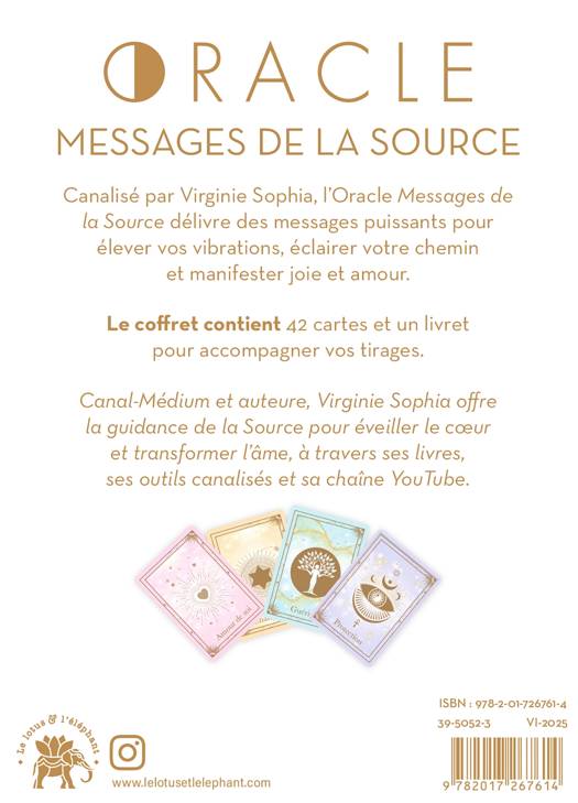 Canalisé par Virginie Sophia, l'Oracle Messages de la Source délivre des messages puissants pour élever vos vibrations, éclairer votre chemin et manifester joie et amour. Le coffret contient 42 cartes et un livret pour accompagner vos tirages.