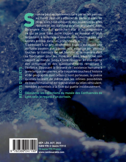 Si on ne peut véritablement faire parler les pierres, au moins peut-on s'efforcer de parler d'elles, de ce qu'elles nous évoquent, des souvenirs qu'elles ravivent et des bienfaits qu'elles procurent. Ainsi Bérengère Cournut s'attache-t-elle à « comprendre ce qui se joue dans notre rapport au minéral et, plus largement, à la Terre que nous roulons sous nos pas, aux secrets enfouis dans ses profondeurs. »