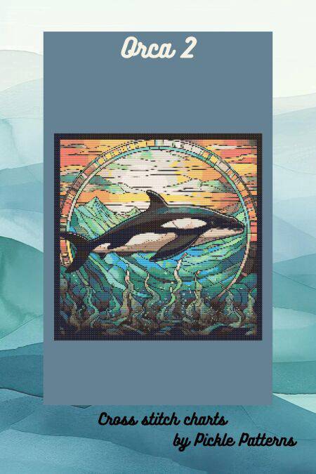 These cross stitch charts are a whimsical design of an orca or killer whale reminiscent of art nouveau stained glass.