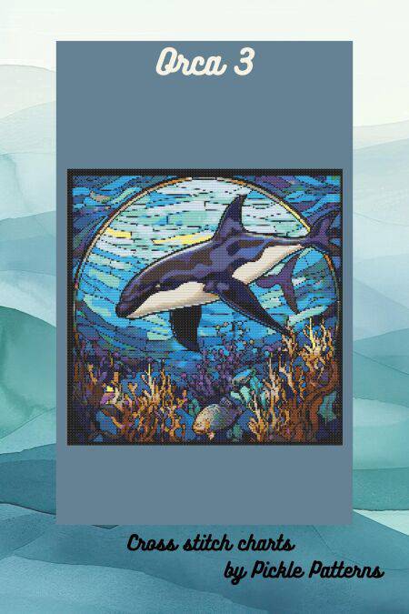 These cross stitch charts are a whimsical design of an orca or killer whale reminiscent of art nouveau stained glass.