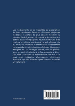 Les médicaments et les modalités de prescription évoluent rapidement. Beaucoup d’internes, de jeunes médecins et parfois de plus aguerris hésitent au moment de rédiger une ordonnance et les recommandations qui l’accompagnent. Pour leur offrir une aide pratique immédiate, une équipe de spécialistes a mis au point un ensemble d’ordonnances commentées correspondant à des situations cliniques fréquentes. Rédigées en DCI, de façon précise, avec les posologies, les contre-indications et les précautions d’emploi, elles constituent un aide-mémoire précieux pour tous ceux, médecins, pharmaciens, infirmières, étudiants, qui sont amenés à prescrire ou à surveiller un traitement.