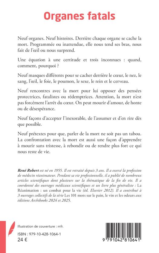 Neuf organes. Neuf histoires. Derrière chaque organe se cache la mort. Programmée ou inattendue, elle nous tend ses bras, nous fait de l'oeil ou nous surprend. Une équation à une certitude et trois inconnues: quand, comment, pourquoi ? Neuf masques différents pour se cacher derrière le coeur, le nez, le sang, l'oeil, le foie, le poumon, le sexe, le rein et le cerveau. Neuf rencontres avec la mort pour lui opposer des pensées protectrices, fatalistes ou rédemptrices. Attention, la mort n'est pas forcément l'arrêt du coeur. On peut mourir d'amour, de honte ou de désespérance. Neuf façons d'accepter l'inexorable, de l'assumer et d'en rire dès que possible. Neuf prétextes pour que, parler de la mort ne soit pas un tabou. La confrontation avec la mort est aussi une façon d'apprendre à mourir sans tristesse, à rebondir ou de rendre plus fort ce qui nous reste de vie.