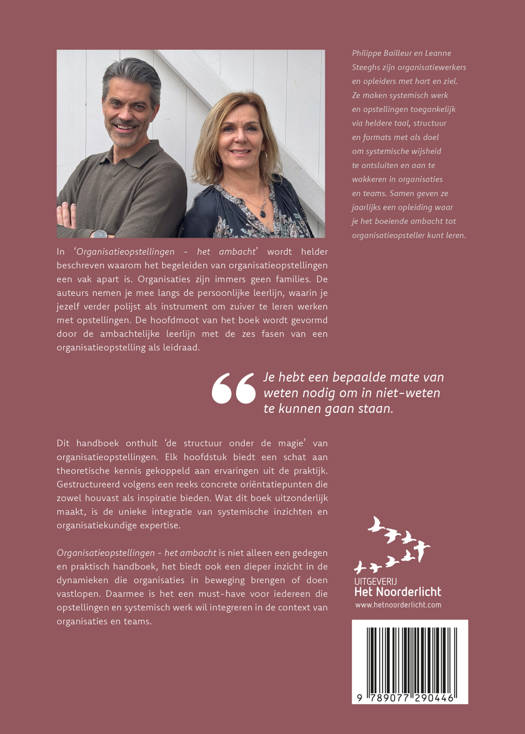 Over de auteurs Philippe Bailleur en Leanne Steeghs zijn organisatiewerkers en opleiders met hart en ziel. Ze maken systemisch werk en opstellingen toegankelijk via heldere taal, structuur en formats met als doel om systemische wijsheid te ontsluiten en aan te wakkeren in organisaties en teams. Samen geven ze jaarlijks een opleiding waar je het boeiende ambacht tot organisatieopsteller kunt leren.