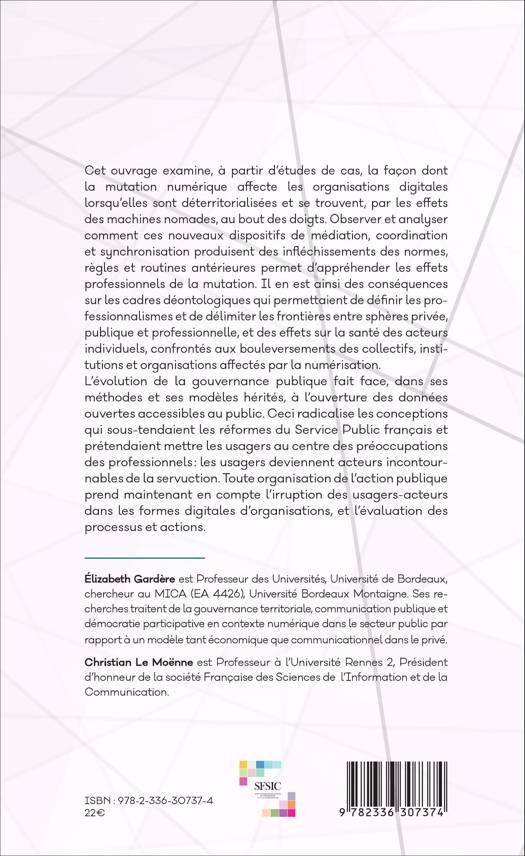Cet ouvrage observe et analyse comment les nouveaux dispositifs de médiation, coordination et synchronisation produisent des infléchissements des normes, règles et routines antérieures permet d'appréhender les effets professionnels de la mutation. Il en est ainsi des conséquences sur les cadres déontologiques qui permettaient de définir les professionnalismes et de délimiter les frontières entre sphères privée, publique et professionnelle, et des effets sur la santé des acteurs individuels, confrontés aux bouleversements des collectifs, institutions et organisations affectées par la numérisation.
