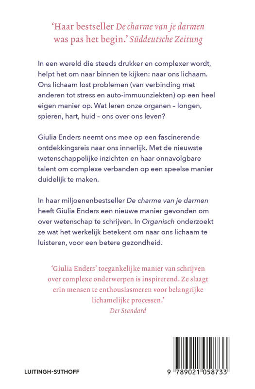 In Organisch onderzoekt arts en onderzoeker Giulia Enders (bekend van haar miljoenenbestseller De charme van je darmen) hoe we gezonder kunnen leven door beter naar ons lichaam te luisteren. In een wereld die steeds drukker en complexer wordt, is gezond leven niet altijd makkelijk. Wat is gezond leven precies, en waarom blijkt het vaak zo moeilijk te zijn? We weten in grote lijnen namelijk prima wat goed is: voldoende bewegen, voedzaam eten, regelmatig slapen. Dus waarom is het dan zo moeilijk om daarnaar te leven? Ons lichaam lost problemen (van verbinding met anderen tot stress en auto-immuunziekten) op een heel eigen manier op. Maar hoe werken onze longen, spieren, huid en ons immuunsysteem? Enders laat zien hoe onze organen functioneren en zijn verbonden met de buiterenwereld waarin we leven – en hoe groot hun invloed is op zowel onze mentale als onze fysieke gezondheid. Op meesterlijke wijze combineert ze de laatste wetenschappelijke inzichten met persoonlijke verhalen en oude wijsheden, en geeft ze talloze relevante en praktische adviezen voor een werkelijk betere gezondheid.