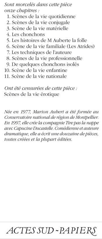 «Née en 1977, Marion Aubert a été formée au conservatoire national de région de Montpellier. En 1997, elle crée la compagnie Tire pas la nappe avec Capucine Ducastelle. Comédienne et auteur dramatique, elle a écrit une douzaine de pièces, toutes créées et la plupart éditées.»