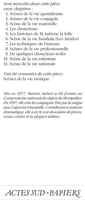 «Sont morcelés dans cette pièce onze chapitres :» 1. Scènes de la vie quotidienne 2. Scènes de la vie conjugale 3. Scène de la vie matérielle 4. Les chonchons 5. Les histoires de M Auberte la folle 6. Scène de la vie familiale (Les Atrides) 7. Les techniques de l'auteure 8. Scènes de la vie professionnelle 9. De quelques chonchons isolés 10. Scène de la vie enfantine 11. Scène de la vie nationale