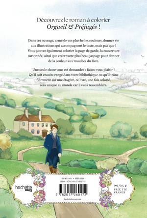 Armé de vos plus belles couleurs, donnez vie aux illustrations qui accompagnent le texte de Jane Austen dans sa version intégrale. En plus des nombreuses illustrations intérieures, vous pourrez également colorier la page de garde, la couverture cartonnée qui se cache sous une jaquette en couleur, ainsi que créer votre plus beau jaspage pour donner de la couleur aux tranches du livre. Une seule chose vous est demandée : faites-vous plaisir ! Qu’il soit ensuite rangé dans votre bibliothèque ou qu’il trône fièrement sur une étagère, ce livre, une fois colorié, sera unique au monde car il vous ressemblera.