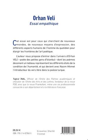Cet essai est pour ceux qui cherchent de nouveaux mondes, de nouveaux moyens d'expression, des différents aspects humains de l'homme du quotidien pour élargir les frontières de l'art poétique. L'auteur nous propose d'entrer dans l'univers d'Orhan VEL – poète des petites gens d' stanbul – dont les poèmes dessinent un tableau représentant les différents états de la condition de l'humanité, et qui devient avec Naz m Hikmet l'introducteur du vers libre dans la poésie turque. Tu rul NAL, Officier de l'Ordre des Palmes académiques et chevalier de l'Ordre des Arts et des Lettres, fondateur de la revue FDE ainsi que la revue Frankofoni, mène une vie professionnelle consacrée à son département et à la littérature française.