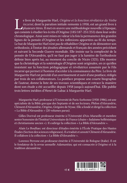 Le livre de Marguerite Harl, Origene et la fonction revelatrice du Verbe incarne, dont la parution initiale remonte a 1958, est un grand livre a plusieurs titres. Il met en oeuvre une methodologie nouvelle a l'epoque, qui consiste a etudier les ecrits d'Origene (185/187-251/253) dans leur ordre chronologique. Ainsi sont mises en valeur a la fois la permanence des grandes lignes de la pensee d'Origene et les inflexions apportees au fil du temps. Le but de Marguerite Harl n'est pas de rehabiliter Origene et de demontrer son orthodoxie, a l'instar des jesuites allemands et francais des annees precedant et suivant la Seconde Guerre mondiale. Elle insiste sur la complexite de la pensee de l'Alexandrin, qu'il ne faut pas juger a la lumiere de l'orthodoxie definie bien apres lui, au moment du concile de Nicee (325). Elle montre que la christologie et la soteriologie d'Origene sont originales, en ce qu'elles insistent sur la fonction pedagogique et revelatrice assumee par le Fils incarne qui permet a l'homme d'acceder a la connaissance du Pere. Le livre de Marguerite Harl est precede d'un avertissement et suivi d'une postface, rediges par trois de ses collaborateurs. La postface propose une courte biographie de l'auteur, donne la liste de ses travaux scientifiques et retrace la maniere dont son etude a ete accueillie depuis 1958 jusqu'a aujourd'hui. Elle publie trois lettres inedites d'Henri de Lubac a Marguerite Harl.