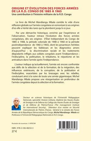Ce livre comble le vide d'une réflexion globale sur l'armée congolaise en remontant à ses origines d'où elle a hérité des tares qui la plombent jusqu'à ce jour. Par une démarche historique, enrichie par l'expérience et l'observation, l'auteur retrace l'évolution des forces armées congolaises, dès ses origines (l'État Indépendant du Congo de 1885 à 1908, la période coloniale de 1908 à 1960 et la période postindépendance de 1960 à 1965), dont les pesanteurs héritées peuvent expliquer les faiblesses et les diagnostics amers d'aujourd'hui: la discrimination raciale et les traitements dégradants infligés aux soldats congolais avant l'indépendance; l'indiscipline, la politisation, le tribalisme, le népotisme et les antivaleurs dans l'armée après l'indépendance. L'auteur indique qu'actuellement, l'armée est encore confrontée aux défis de la sélection et de la formation, de la mégestion, des influences extérieures, de la corruption, de la politisation et l'indiscipline, exacerbées par les brassages avec les rebelles, conduisant ainsi à la ruine de toute une armée gigantesque. Michel Mandiangu Mbala propose une réorganisation en profondeur de l'armée congolaise depuis la sélection et la formation.