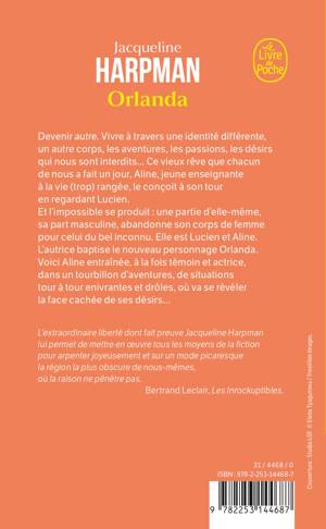 Et l’impossible se produit : une partie d’elle-même, sa part masculine, abandonne son corps de femme pour celui du jeune inconnu. Elle est Lucien et Aline. L’auteur baptise le nouveau personnage Orlanda. Voici Aline entraînée, à la fois témoin et actrice, dans un tourbillon d’aventures, de situations tour à tour enivrantes et drôles, où va se révéler la face cachée de ses désirs…
