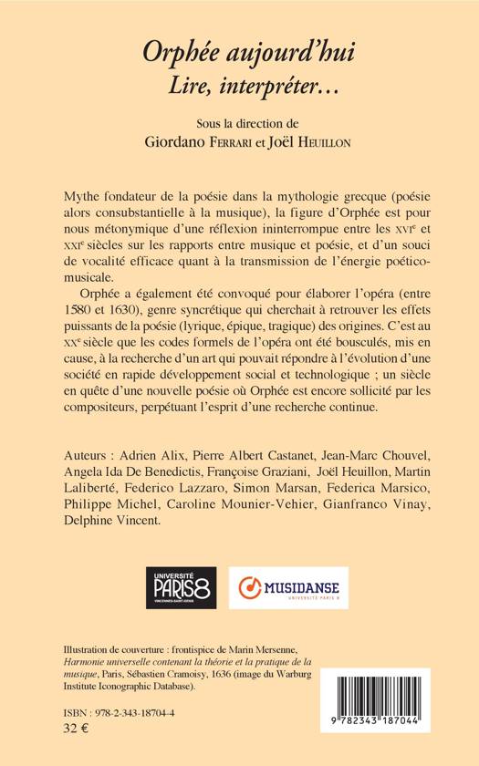 Mythe fondateur de la poésie dans la mythologie grecque, la figure d'Orphée est métonymique d'une réflexion ininterrompue depuis le XVIe siècle sur les rapports entre musique et poésie. Convoqué pour élaborer l'opéra entre 1580 et 1630, Orphée est encore sollicité au XXe siècle par des compositeurs en quête d'une poésie nouvelle.