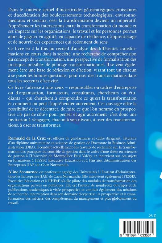 Dans le contexte actuel d’incertitudes géostratégiques croissantes et d’accélération des bouleversements technologiques, environnementaux et sociaux, oser la transformation devient un impératif. Appréhender les interactions entre la transformation du monde et ses impacts sur les organisations, le travail et les personnes permet alors de gagner en agilité, en capacité de résilience, d’apprentissage et de nourrir des expériences qui redonnent du sens. Ce livre est à la fois un recueil d’analyse des différentes transformations en cours dans la société, une recherche de compréhension du concept de transformation, une perspective de formalisation des pratiques possibles de pilotage transformationnel. Il se veut également être une base de réflexion et d’action, visant tout un chacun à se poser les bonnes questions, pour oser des transformations dans tous les secteurs d’activité. Ce livre s’adresse à tous ceux – responsables ou cadres d’entreprise ou d’organisation, formateurs, consultants, chercheurs ou étudiants – qui cherchent à comprendre ce qu’est la transformation et comment on peut l’appréhender autrement. Cet ouvrage offre la possibilité de se décentrer, de faire ce que l’on nomme en prospective « le pas de côté » pour penser et agir autrement ; c’est donc une invitation à s’engager, chacun à son niveau, à oser des transformations, à oser se transformer.