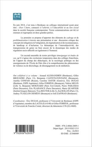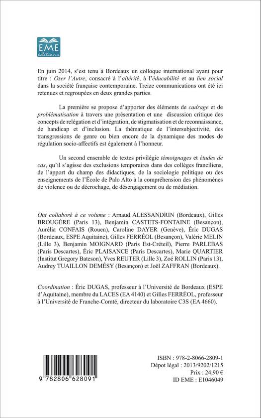 En juin 2014, s'est tenu à Bordeaux le colloque : Oser l'Autre, consacré à l'altérité, à l'éducabilité et au lien social dans la société française contemporaine. Une première série d'interventions se propose d'apporter des éléments de cadrage et de problématisation à travers une présentation et une discussion critique des concepts de relégation et d'intégration, de stigmatisation et de reconnaissance, de handicap et d'inclusion. Un second ensemble de textes privilégie témoignages et études de cas.