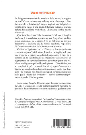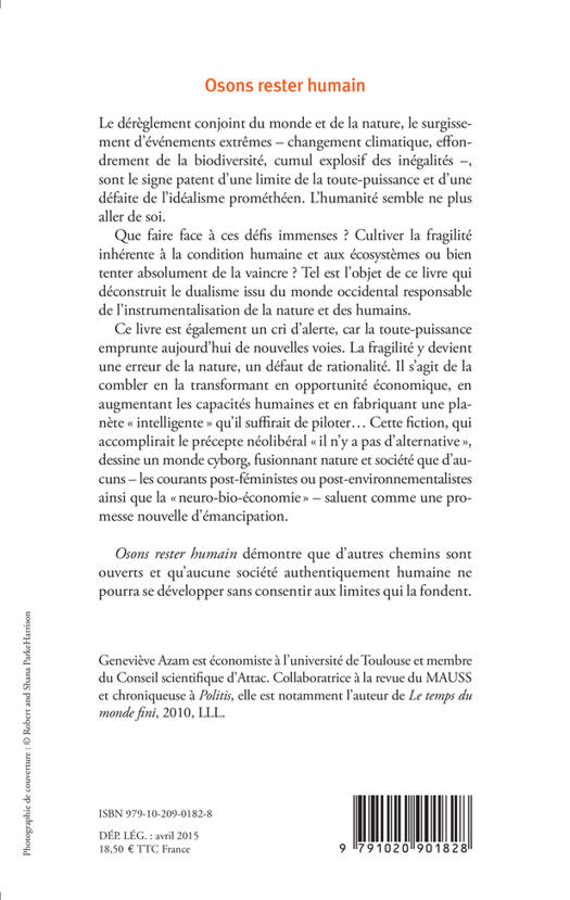 Face à ces défis immenses, doit-on cultiver la fragilité inhérente à l'espèce humaine ou bien tenter de la vaincre ? Tel est l'objet de ce livre, qui s'attache à déconstruire la toute-puissance issue du dualisme occidental, qui a opposé nature et société et autorisé finalement la domination et l'instrumentalisation de la nature et des humains. Cultiver la fragilité est une force créatrice qui rassemble au lieu d'opposer, qui lie au lieu de délier, qui conjugue au lieu de mettre en concurrence, qui refuse fermement la démesure au lieu de l'accentuer dans une course désespérée. Des voix et des pensées diverses ouvrent ce chemin, des expériences multiples indiquent d'ores et déjà une bifurcation.